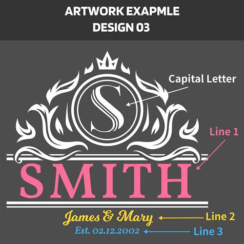 The color parts in the artwork examples can be personalized. Each color refers to one line of personalization.