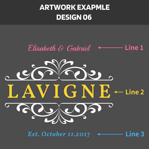 The color parts in the artwork examples can be personalized. Each color refers to one line of personalization.